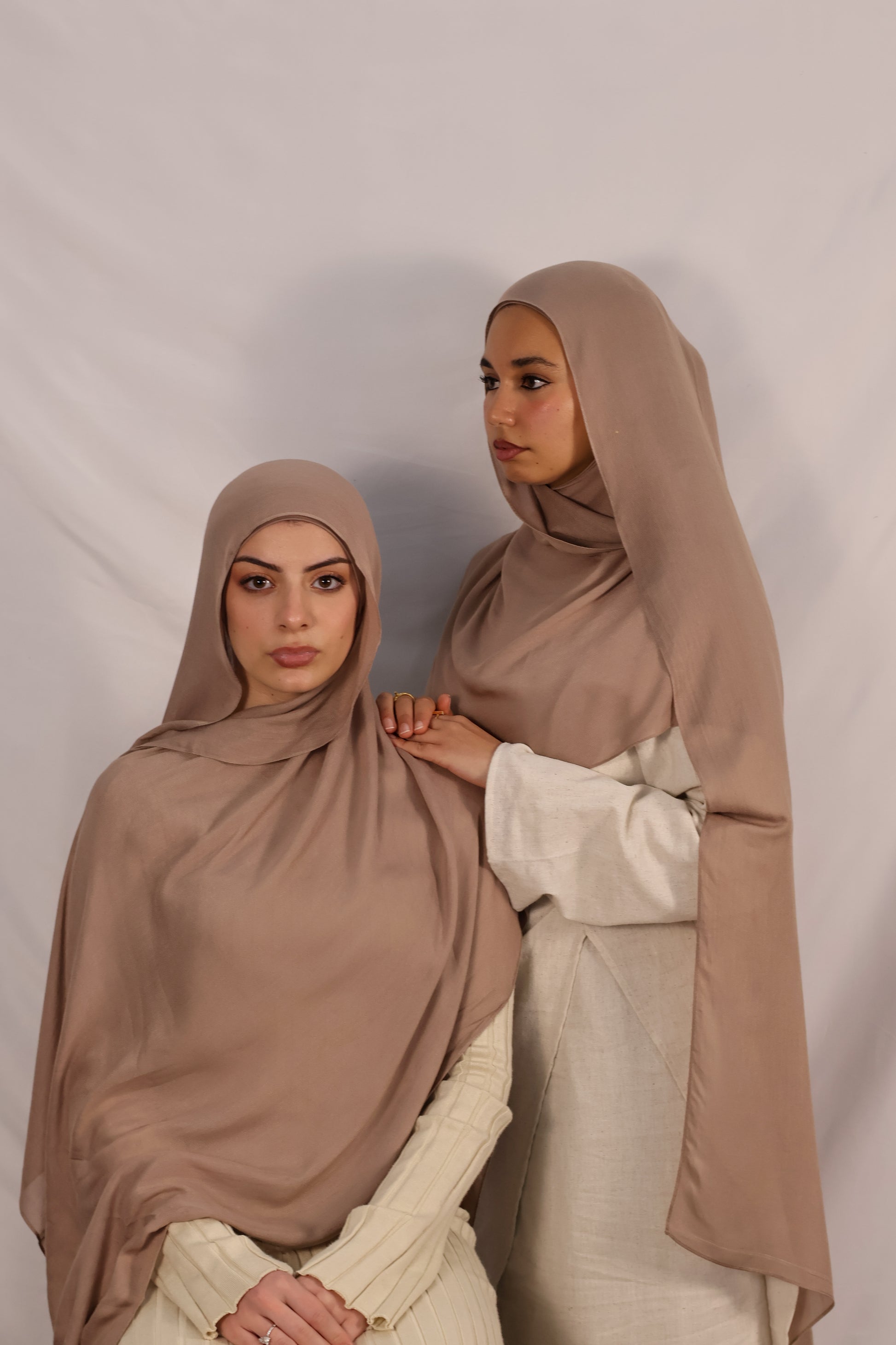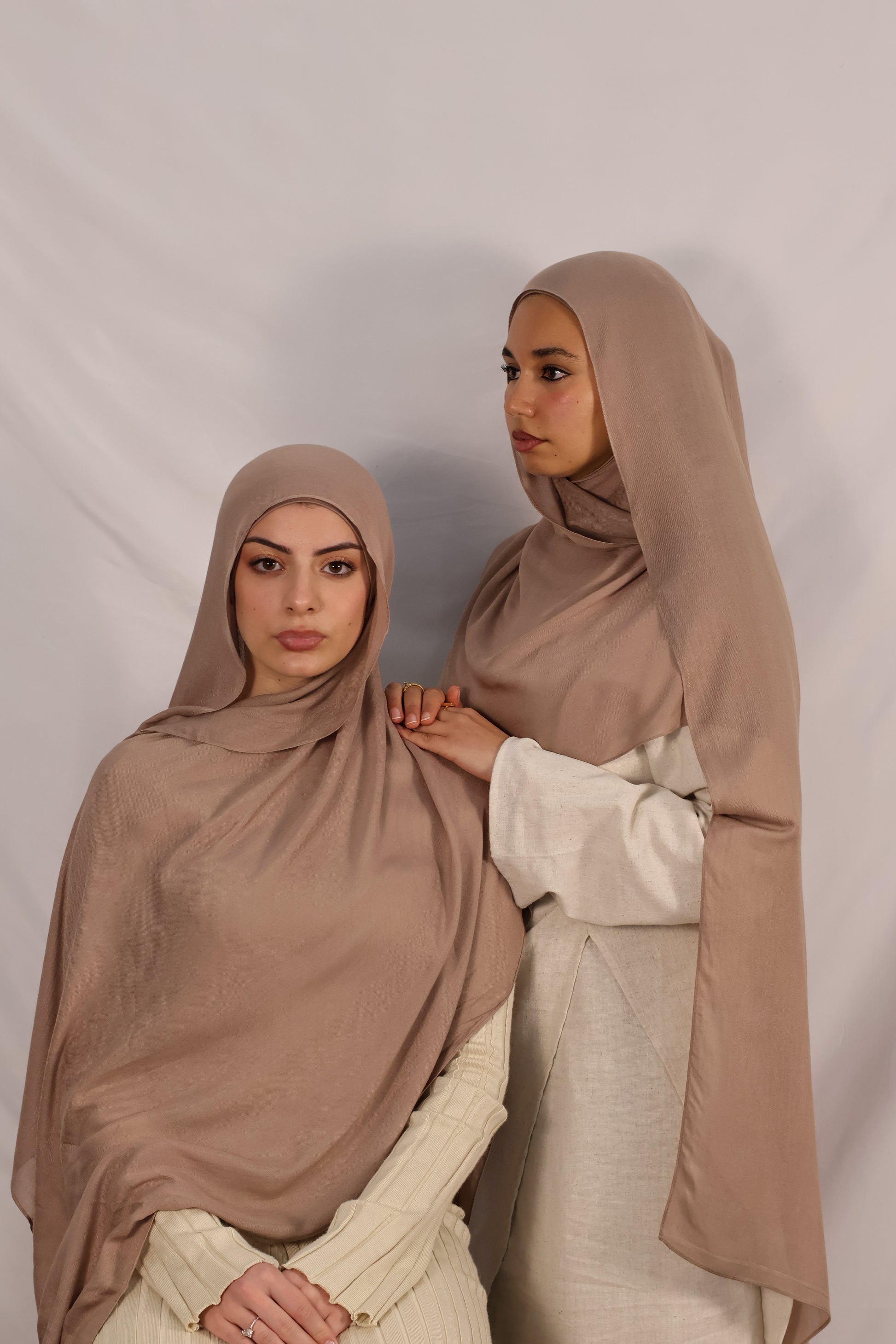 Introducing our DAUS Modal Hijab set in Chestnut, boasting a tighter weave for enhanced opacity. Crafted from our signature opaque bamboo modal fabric, they offer a beautiful sheen and unmatched softness. Versatile and breathable, they drape seamlessly with any style, paired with a matching undercap for full coverage and cohesive styling.