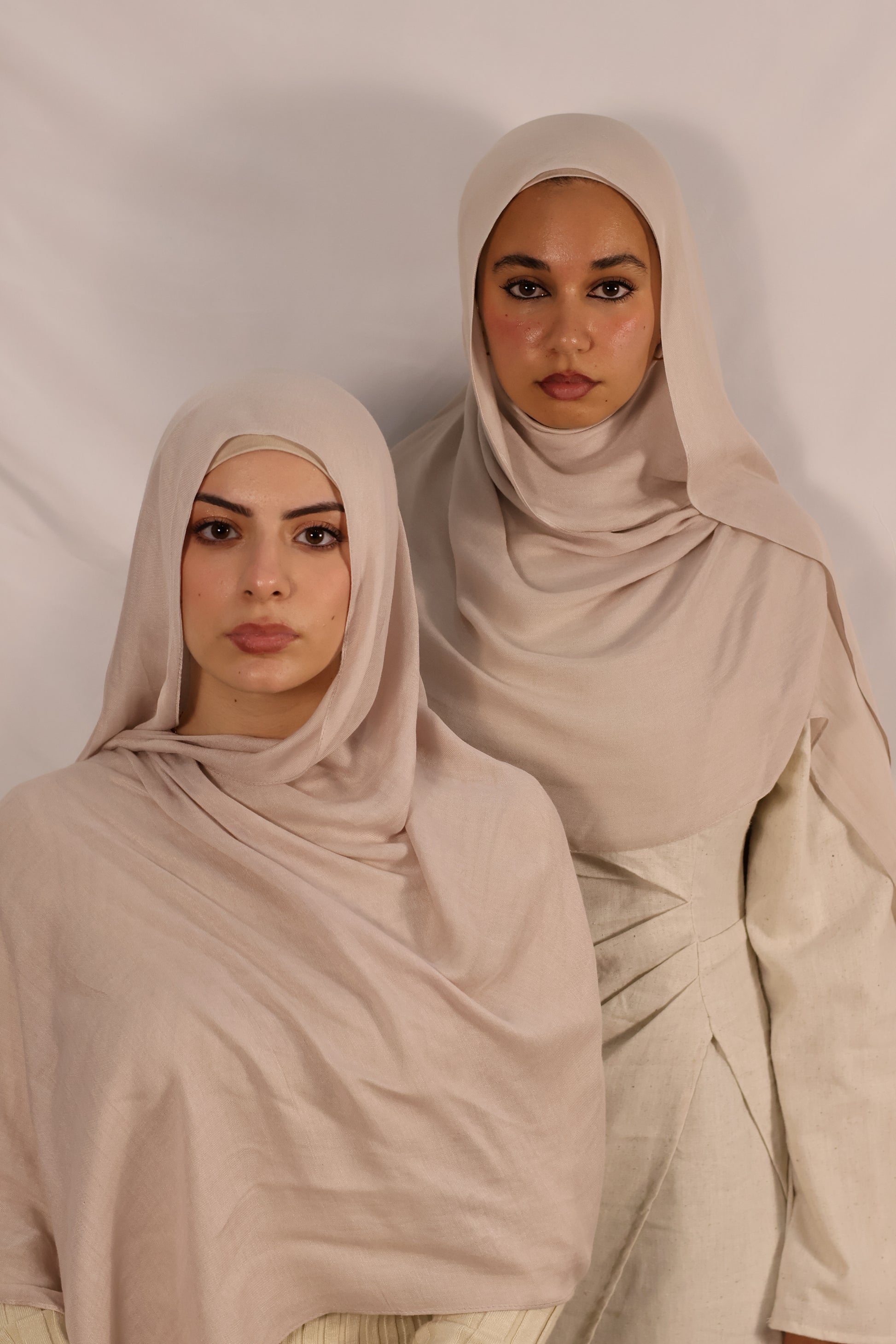 Introducing our DAUS Modal Hijab set in Crema, boasting a tighter weave for enhanced opacity. Crafted from our signature opaque bamboo modal fabric, they offer a beautiful sheen and unmatched softness. Versatile and breathable, they drape seamlessly with any style, paired with a matching undercap for full coverage and cohesive styling.