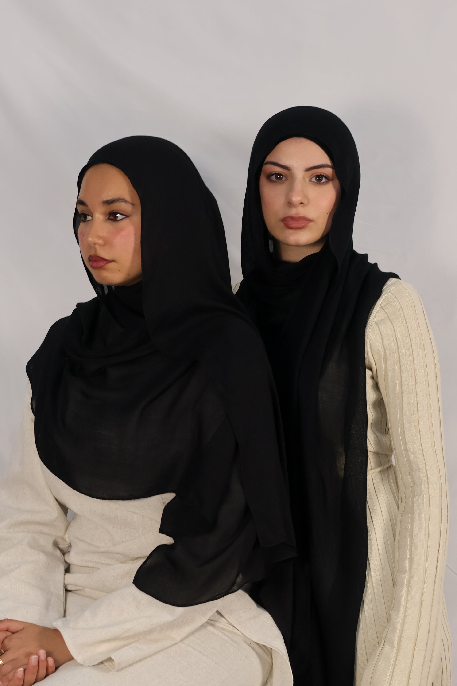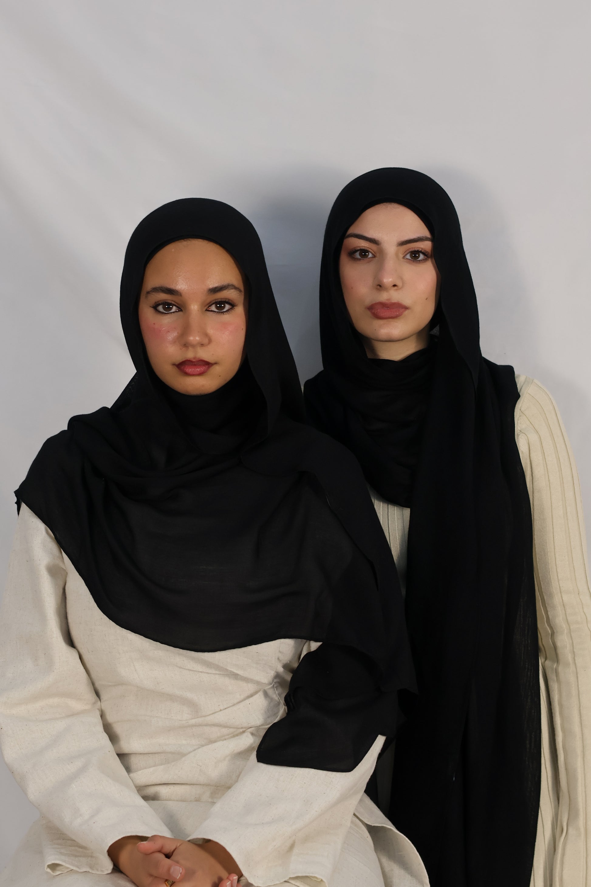 Introducing our DAUS Modal Hijab set in Onyx, boasting a tighter weave for enhanced opacity. Crafted from our signature opaque bamboo modal fabric, they offer a beautiful sheen and unmatched softness. Versatile and breathable, they drape seamlessly with any style, paired with a matching undercap for full coverage and cohesive styling.