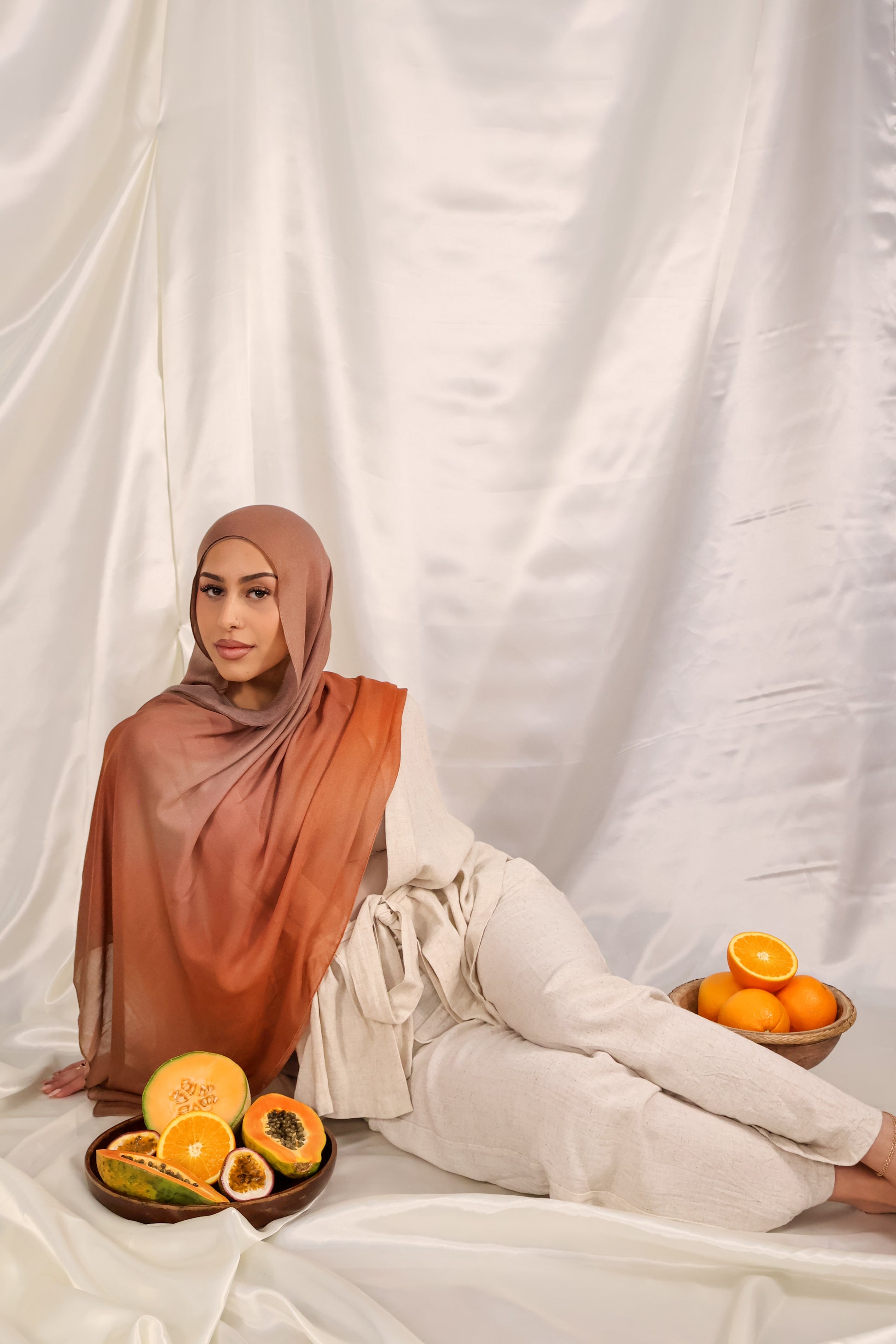 A warm blend of burnt orange and earthy browns with a soft ombré finish. It transitions beautifully, so you can wear it either way depending on your outfit.